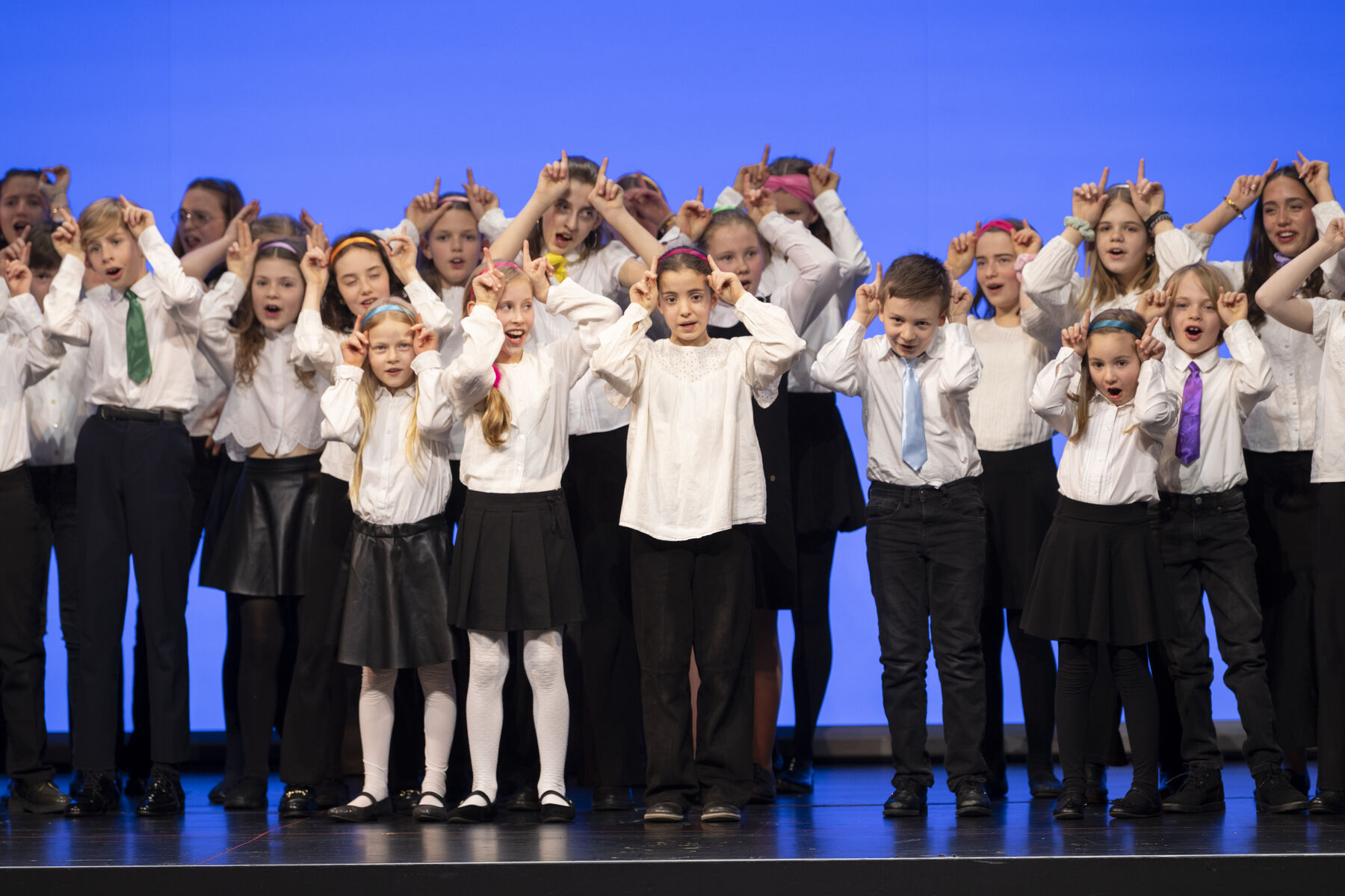 Eine Reihe von Kindern steht auf einer Bühne, singt und hebt die Hände nach oben.